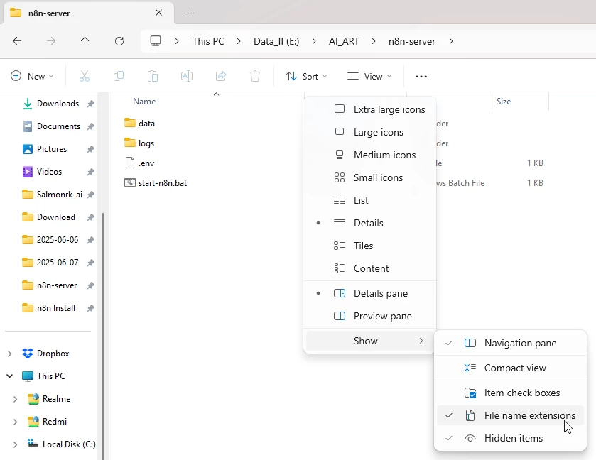 .env(ลบ.txtออก) - หากไม่เห็นนามสกุลไฟล์ ให้ไปที่ View → File name extensions เพื่อเปิดใช้งาน