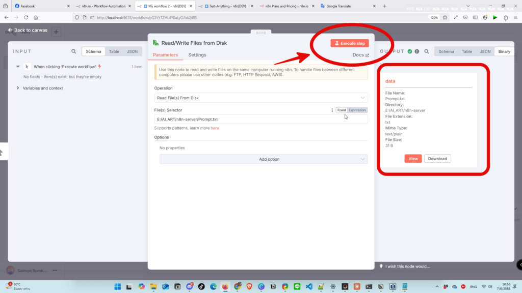 ตอนนี้เราสามารถ ทดสอบ node โดยการกดที่ปุ่ม Execute step ในวงกลมได้