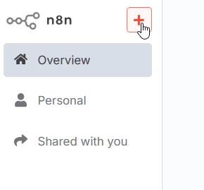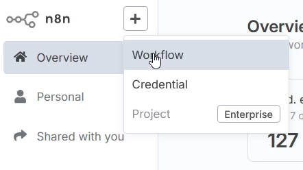 เริ่มต้นที่หน้า แรกของ n8n ที่มุม ซ้ายด้านบน จะมี เครื่องหมาย + สีส้มๆ เมื่อกดแล้ว ให้เลือก workflow เพื่อเริ่มต้นสร้าง
