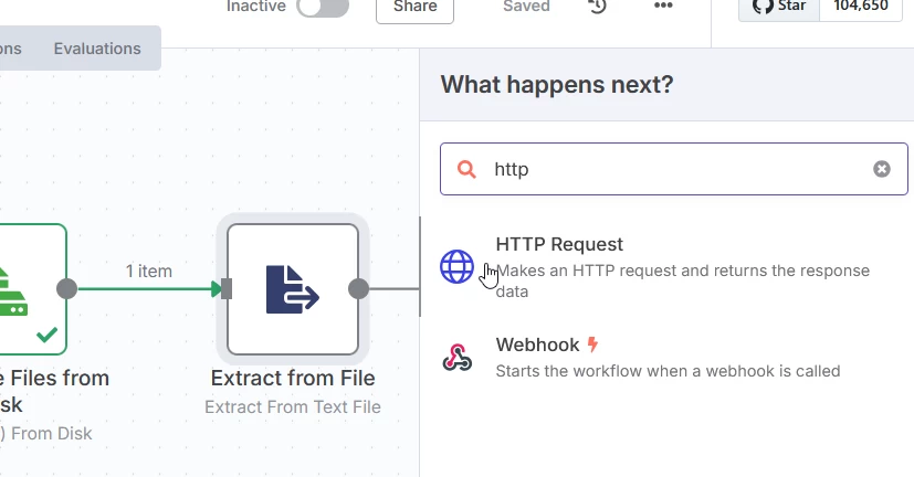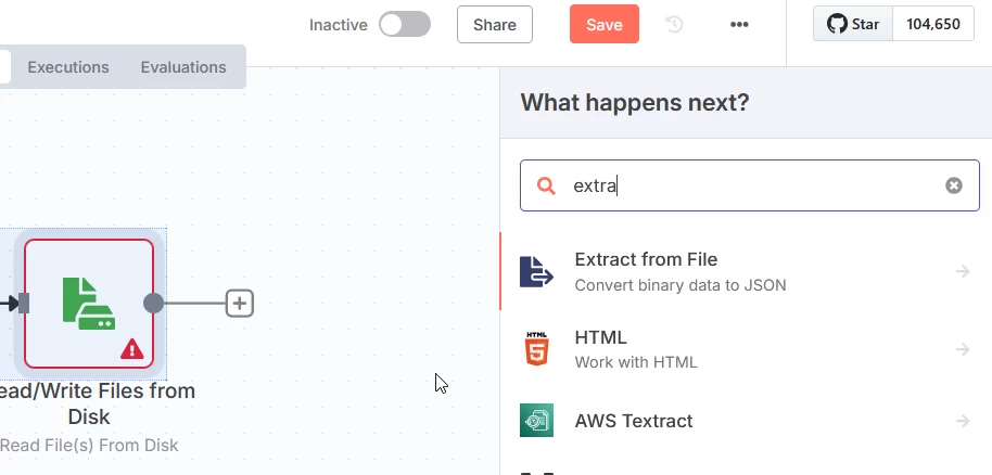- เพิ่ม Extract from File node แล้วเลือก extract from text file