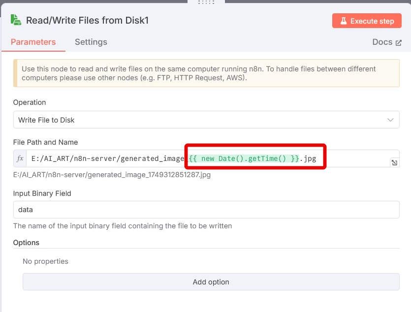 C:/n8n/generated_image_{{ new Date().getTime() }}.jpg - Input Data Field Name: