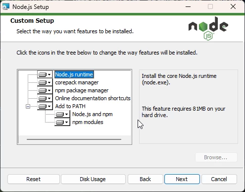 C:\\Program Files\\nodejs\\) - ในหน้า “Custom Setup” ใช้ตาม มาตรฐานที่ระบบตั้งให้